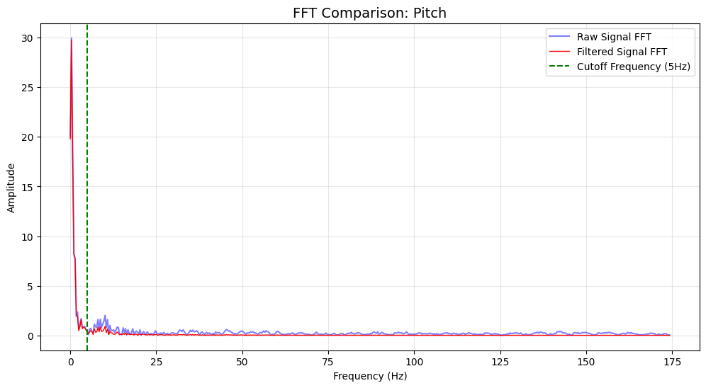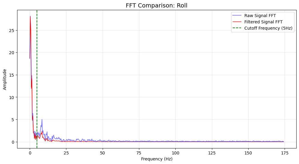 To analyze noise in the signal, I processed it using a Fourier transform. I set the cutoff to 5Hz and calculated $\alpha$ as 0.0793 based on the sampling frequency. Subsequently, I resampled the accelerometer data. After applying low-pass filtering, the overall curve appeared smoother, eliminating the sharp peaks and troughs caused by low-frequency fluctuations in the original data. Upon re-examining the Fourier-transformed signal, we observed a significant reduction in amplitude below the cutoff frequency, confirming that this method effectively suppressed low-frequency components.